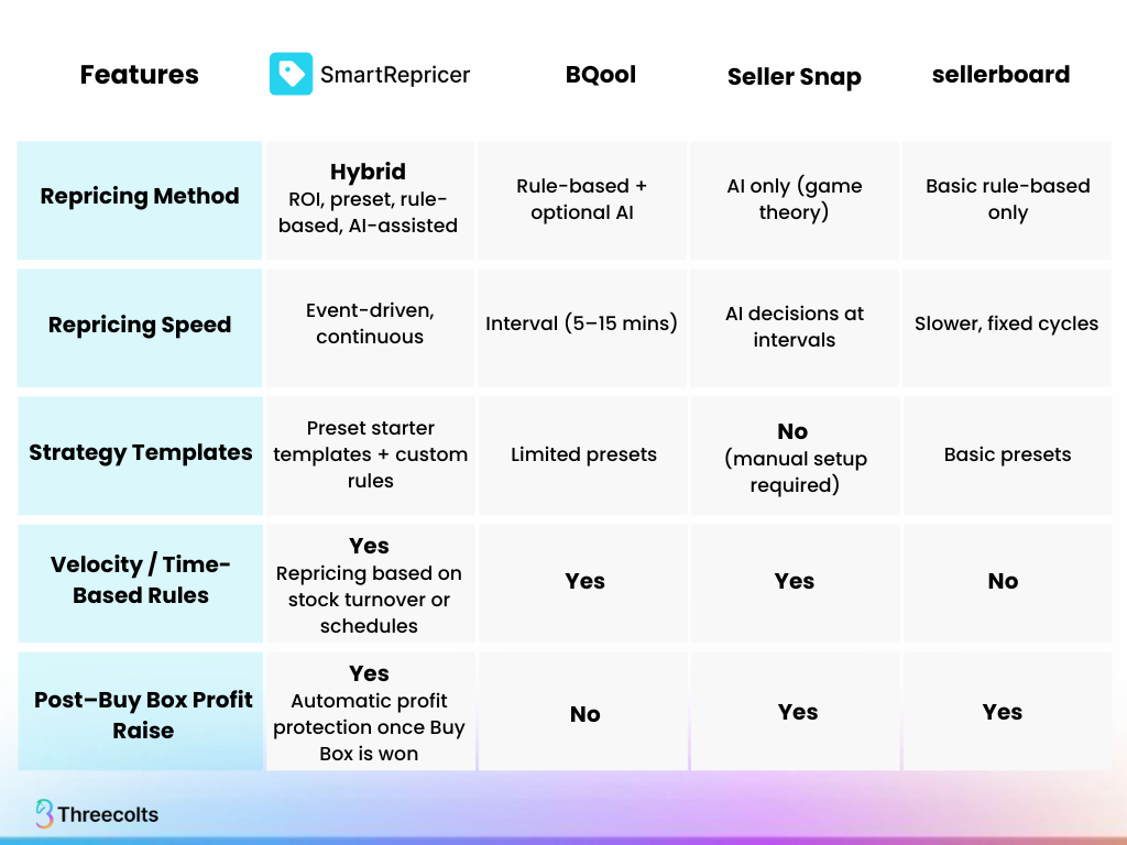 It combines real-time, event-driven repricing with ROI-based and inventory-aware strategies — built to win the Buy Box while protecting profits and reducing manual work.